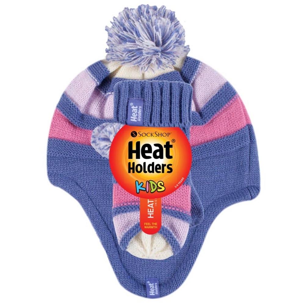 Heat Holders® – Kids Hat & Matching Mittens LAVENDER STRIPE COSY EARS 3-6 Years